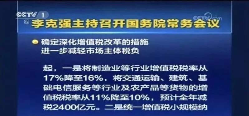 一是将制造业等行业增值税税率从17%降至16%,将交通运输、建筑、基础电信服务等行业及农产品等货物的增值税税率从11%降至10%,预计全年可减税2400亿元。